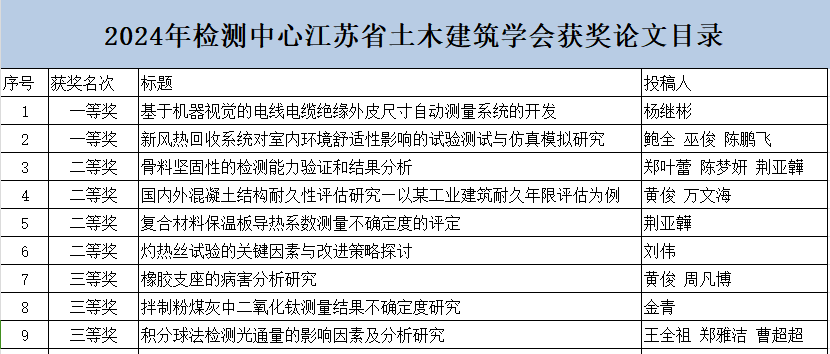 近日,江苏省土木建筑学会建设工程质量检测技术专委会公布了 “2024年度建设工程质量检测技术获奖论文的通报”。在此次通报中,我中心收获颇丰。员工杨继彬、鲍全等人的论文成果卓越,成功摘得学会颁发的优秀论文一等奖桂冠,另有七篇论文凭借其严谨的研究与独特的见解,分别斩获二、三等奖。同时,中心还被授予 “2024 年度优秀组织奖”。