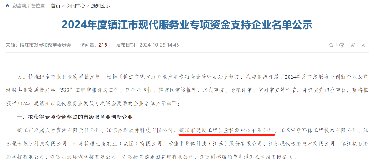 近期,镇江市发展和改革委员会发布了《2024年度镇江市现代服务业专项资金支持企业名单公示》,检测中心经自主申报、辖市区审核推荐、形式审查、专家评审、信用审查等环节,并经委党组会审议,成功入选2024年度镇江市现代服务业创新企业。