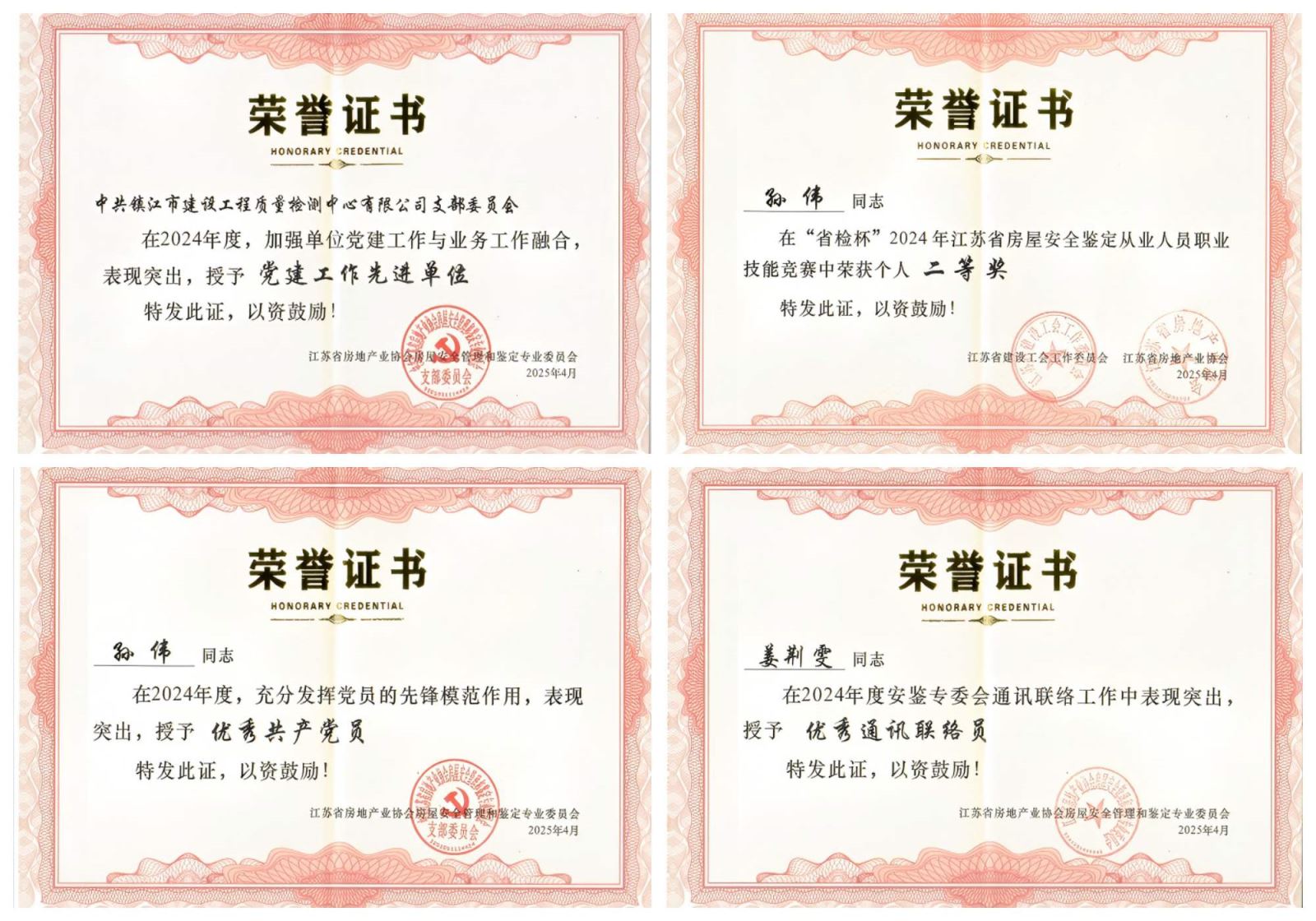 2025年4月,江苏省房地产业协会“房屋安全管理和鉴定专委会2025年会员大会暨学术交流会”在南京召开,会上表彰了2024年度先进单位和个人。我单位和员工均获得多项荣誉称号:检测中心荣获“党建工作先进单位”称号;检验鉴定科孙伟获得“优秀共产党员”称号;检验鉴定科姜荆雯获得“优秀通讯联络员”称号。此外,检验鉴定科孙伟同志还获得了“省检杯”2024年江苏省房屋安全鉴定从业人员职业技能个人二等奖。